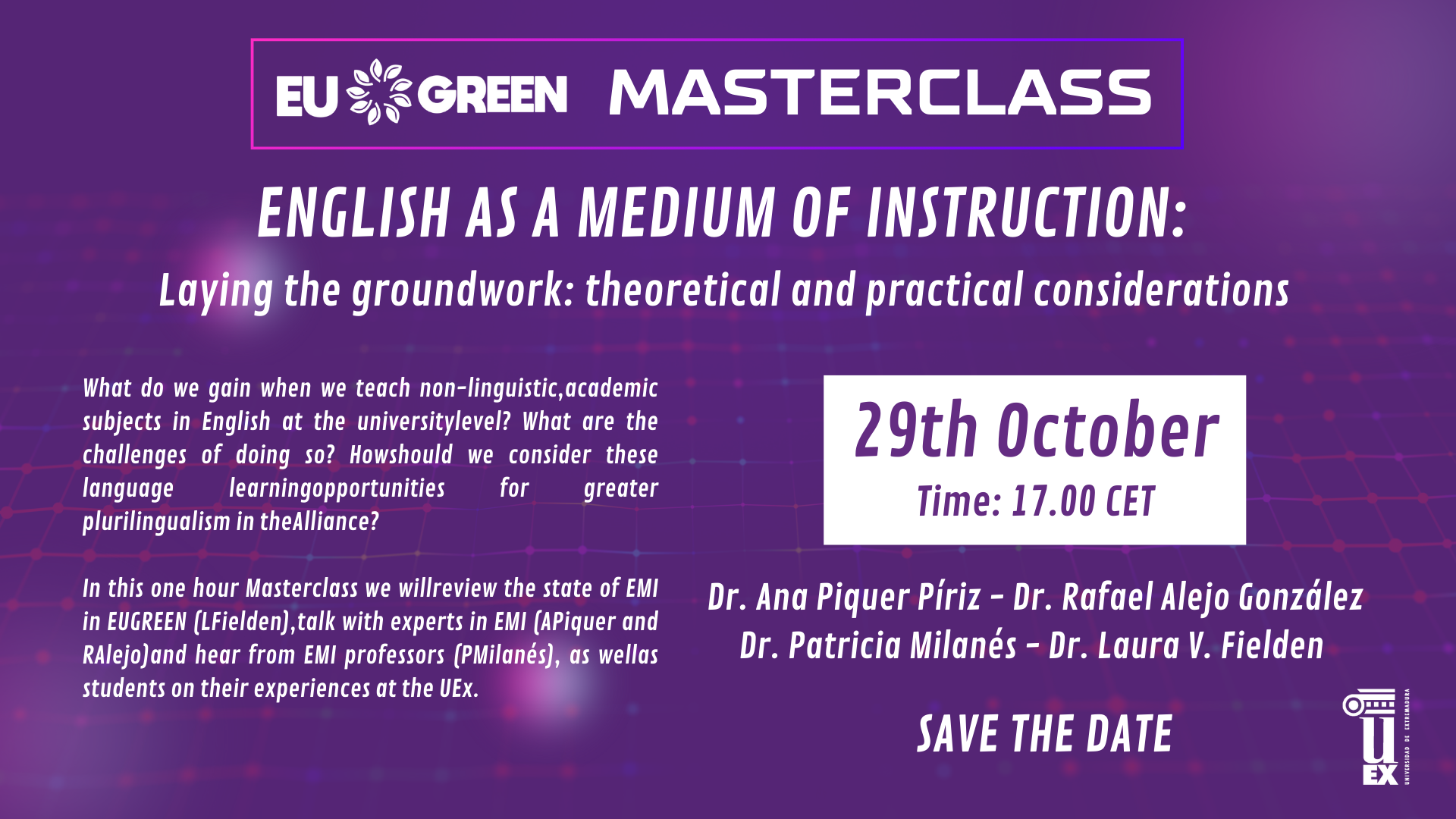 In this one-hour Masterclass, we will dive into the current state of EMI within the EU GREEN Alliance, offering insights from Dr. Laura V. Fielden on the topic. Attendees will also have the opportunity to hear from experts in EMI, Dr. Ana Piquer Píriz and Dr. Rafael Alejo González, as well as from Dr. Patricia Milanés, who will share first-hand experiences of EMI in action. Additionally, UEx students will provide their perspectives on the impact of EMI on their learning journey.