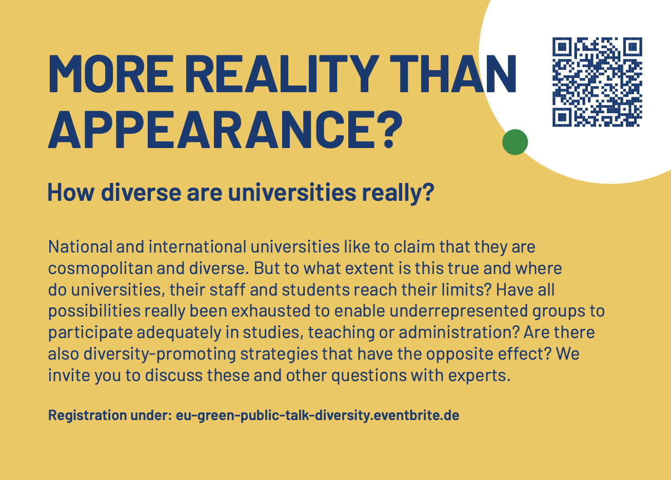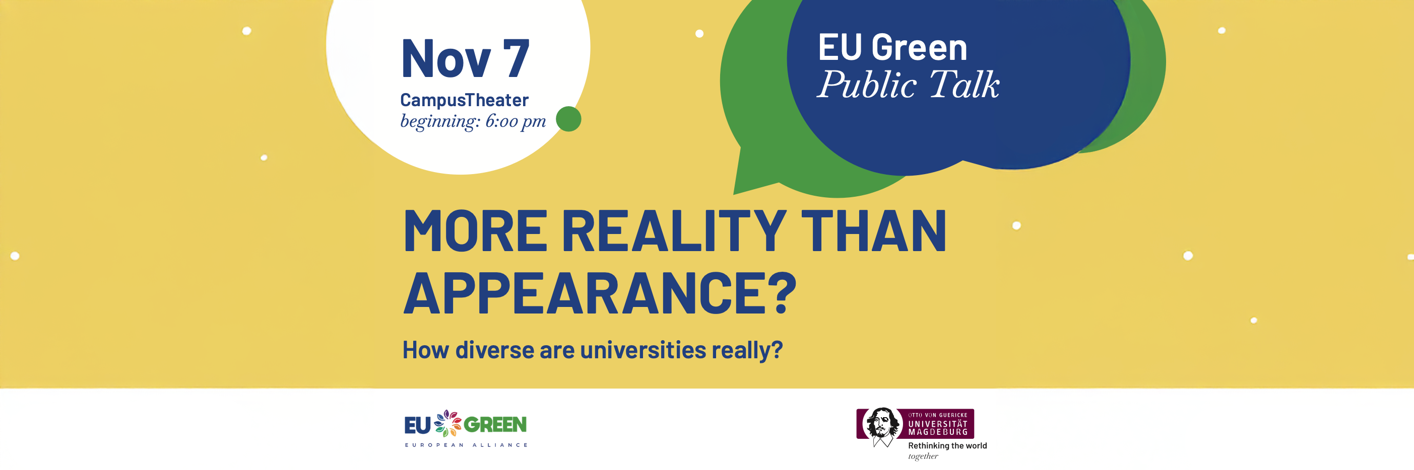 The EU GREEN Public Talk on Diversity, titled “More Reality than Appearance? How Diverse Are Universities Really?” will take place on November 7, 2024, from 6:00 pm to 8:00 pm CET at CampusTheater, J.-G.-Nathusius-Ring 5 in Magdeburg, and will also be accessible online.